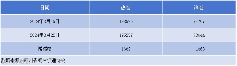据四川省钢材流通协会统计,本周成都地区样本库房中热卷库存量为195257吨,较上周增加1662吨。冷卷库存量为73044吨,较上周减少1663吨。