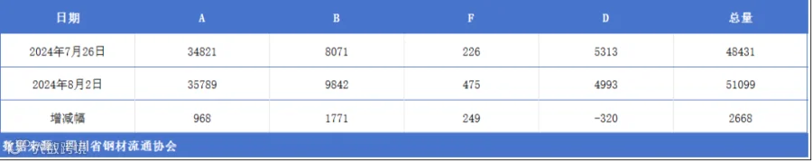 本周四川省钢材流通协会对样本钢厂关于板材出货量统计数据显示,样本库房A出货量35789吨,较上周增加968吨;样本库房B出货9842吨,较上周增加1771吨;样本库房F出货475吨,较上周增加249吨;样本库房D出货4993吨,较上周减少320吨;总出货量51099吨,较上周减少2668吨。