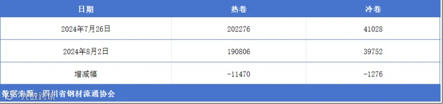 据四川省钢材流通协会统计,本周成都地区样本库房中热卷库存量为190806吨,较上周增减少11470吨。冷卷库存量为39752吨,较上周减少1276吨。