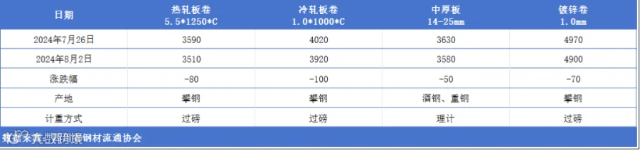 据四川省钢材流通协会对本周成都现货市场监测显示:热轧板卷较上周价格下跌80元/吨;冷轧板卷较上周价格下跌100元/吨;中厚板较上周价格下跌50元/吨;镀锌卷较上周价格下跌70元/吨。