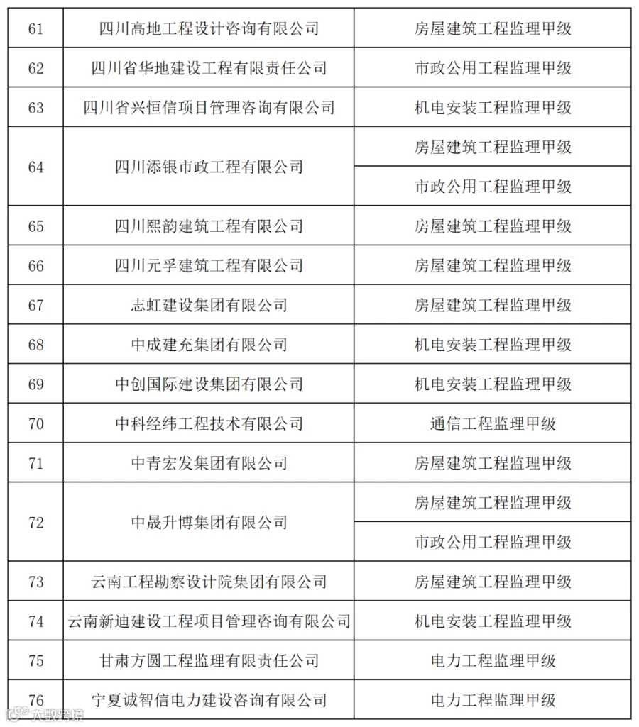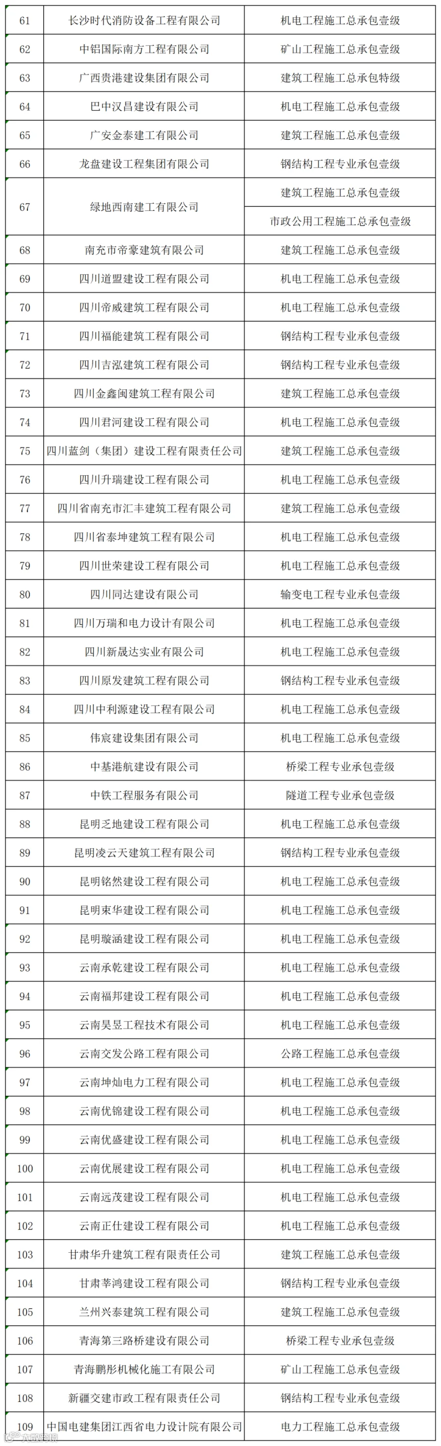施工资质公告:建筑工程施工总承包特级5家,建筑工程施工总承包一级9家。
