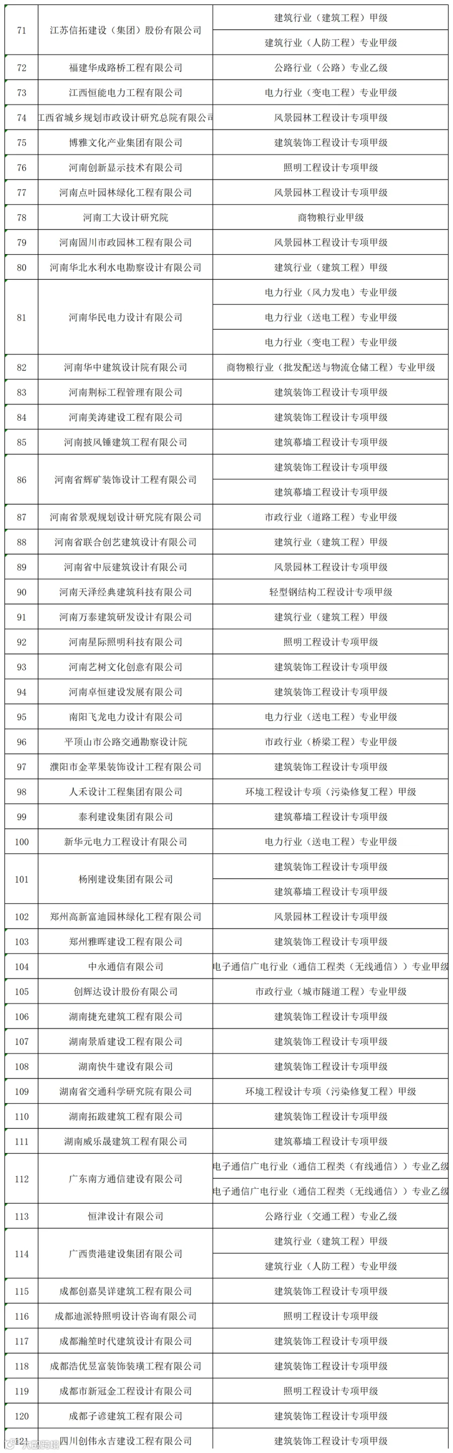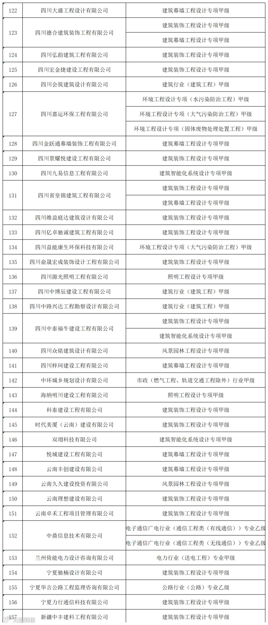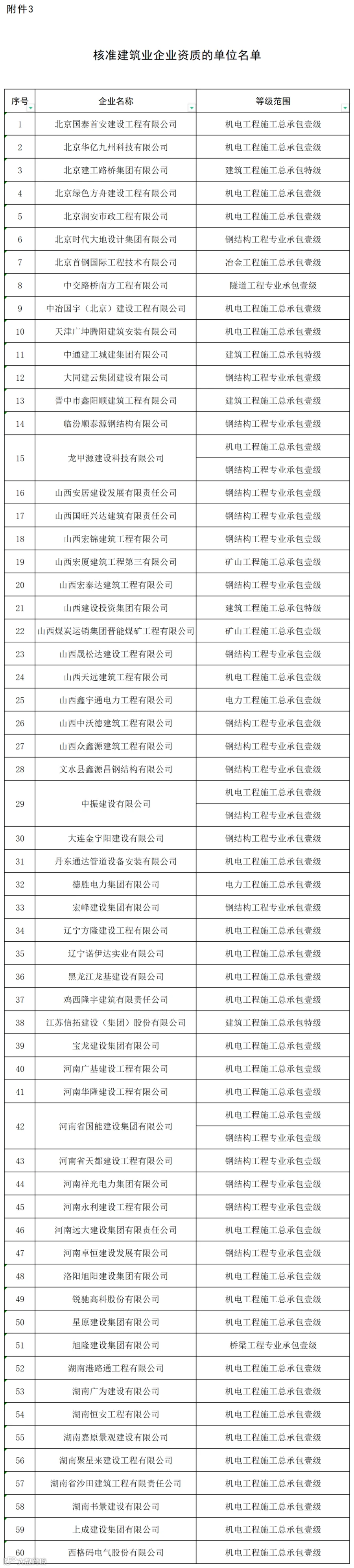 施工资质公告:144家企业,144项资质(其中港口与航道工程施工总承包特级3家,建筑工程施工总承包一级106家,机电工程施工总承包一级17家)