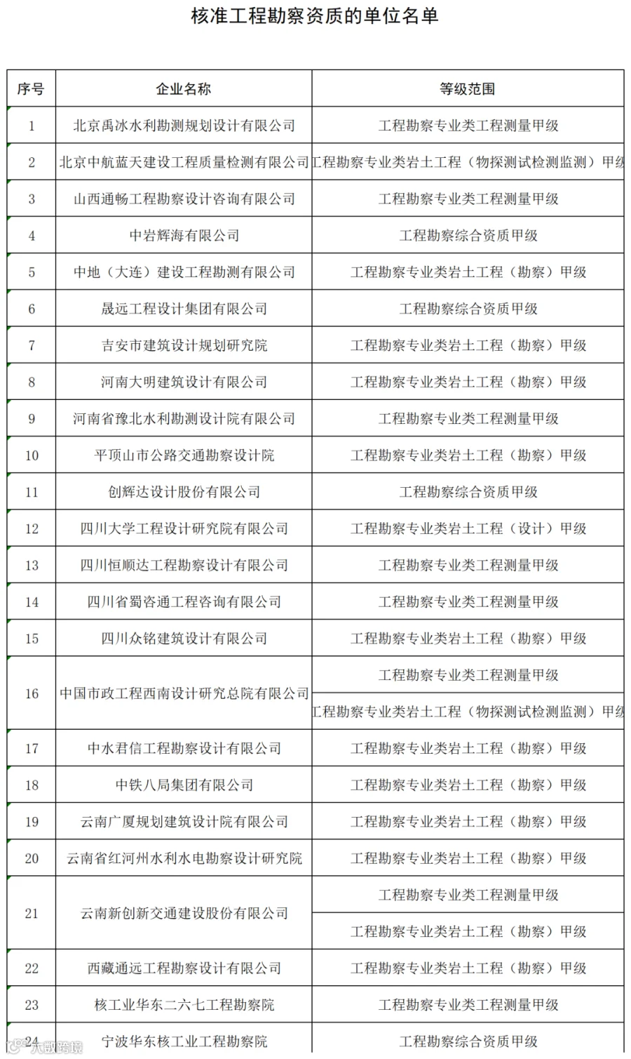 根据《中华人民共和国建筑法》及有关建设工程企业资质管理规定,现将我部核准的工程勘察资质、工程设计资质、建筑业企业资质、工程监理企业资质的单位名单(2023年度第二批)予以公布。未予核准的单位及原因可登录住房和城乡建设部门户网站—政务服务平台,点击办事服务中“申请事项办理进度查询(受理发证信息查询)”栏目进行查询。