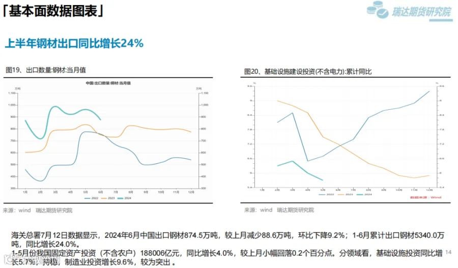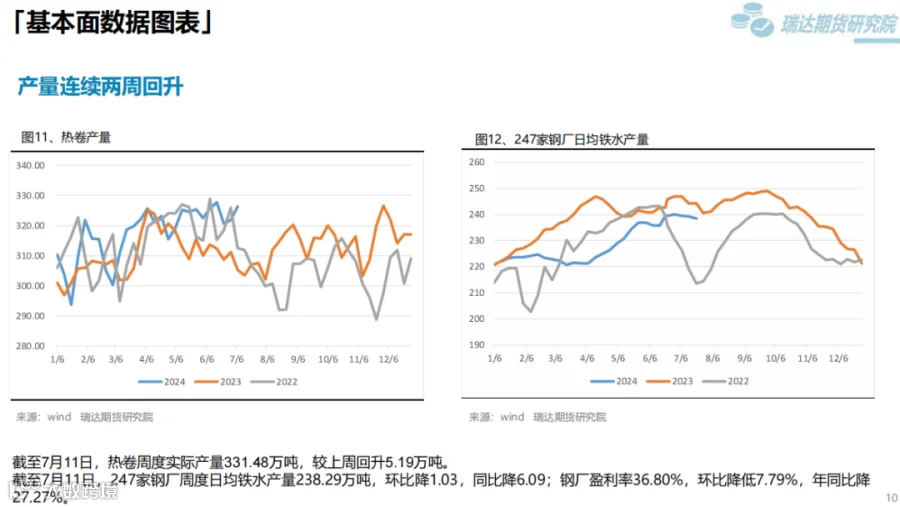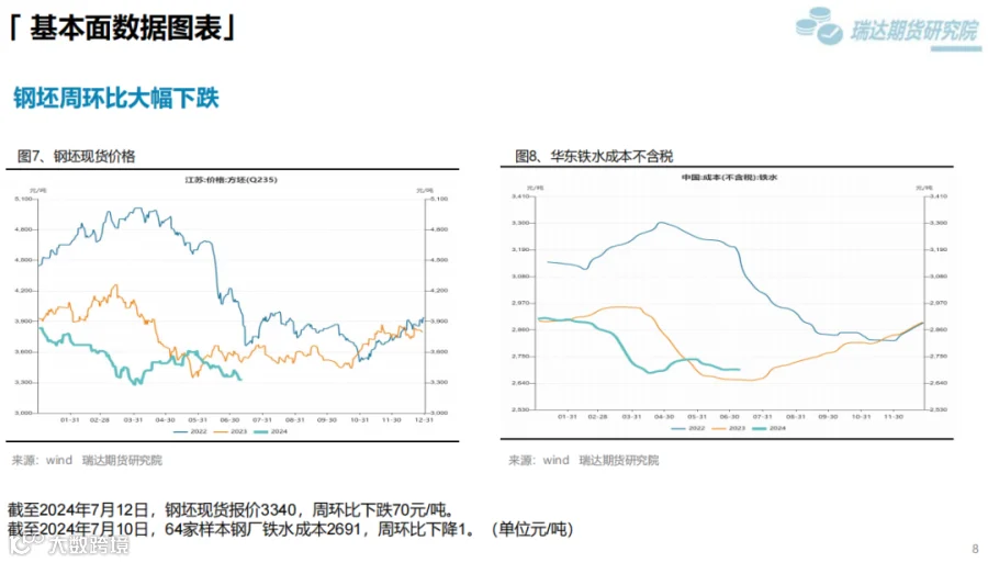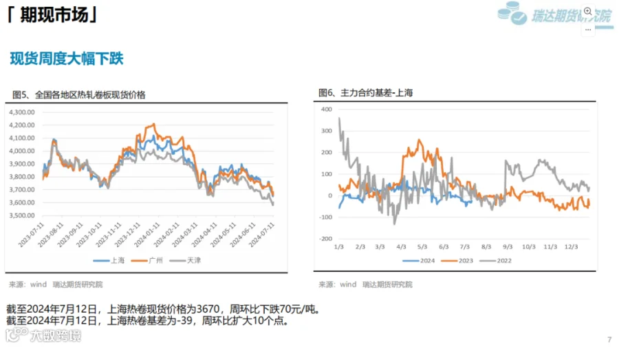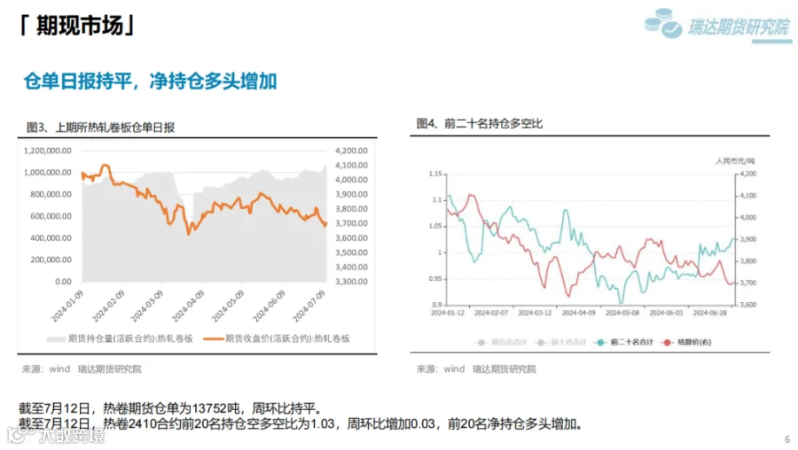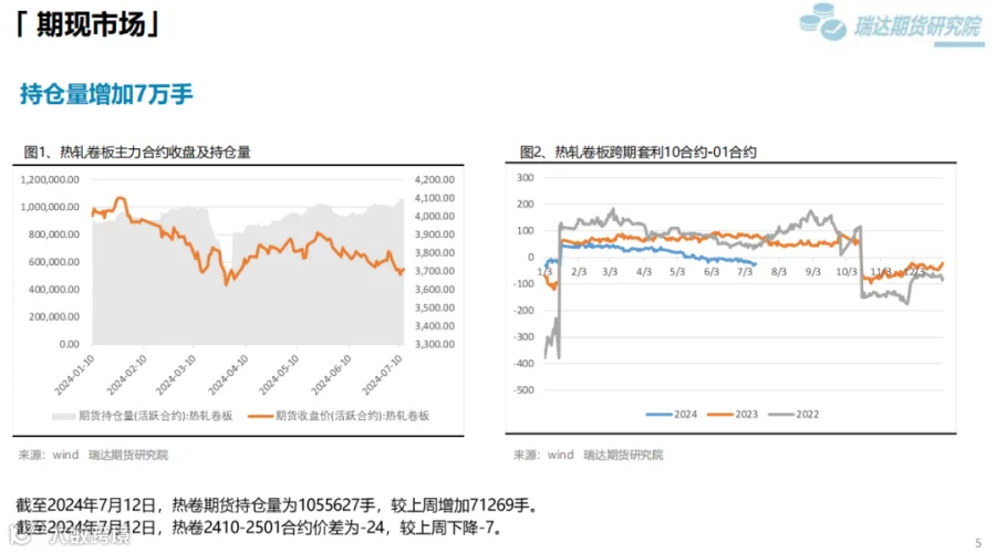 本周(7.5-7.12)供需方面,热卷供强于需,周初现货大幅下跌,促进刚需低价采购,需求有所回升;估值上,利润低位,远月估值高于近月,关注需求成本表现。成本支撑方面,近端,原料期货大幅下跌,现货端双焦持稳,近端成本支撑关注点在铁矿走势,预计有所反复。远端,上半年已经完成全年粗钢压减目标,使得远月成本支撑更强。