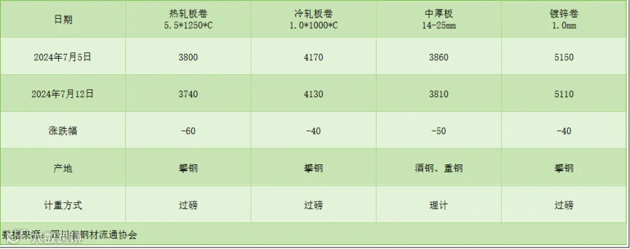 据四川省钢材流通协会对本周成都现货市场监测显示:热轧板卷较上周价格下跌60元/吨;冷轧板卷较上周价格下跌40元/吨;中厚板较上周价格下跌50元/吨;镀锌卷较上周价格下跌40元/吨。