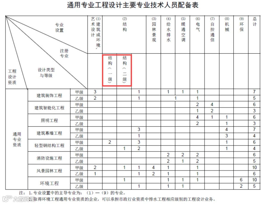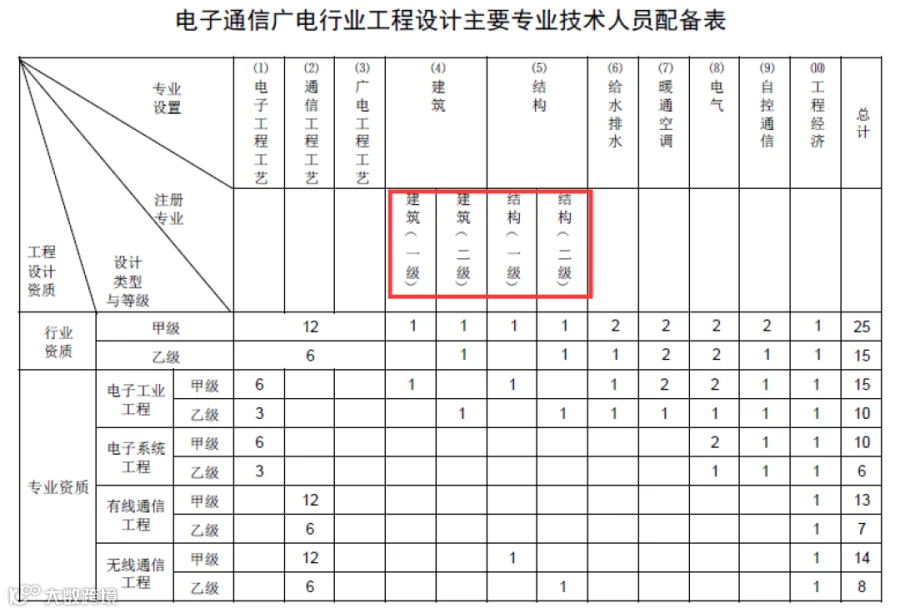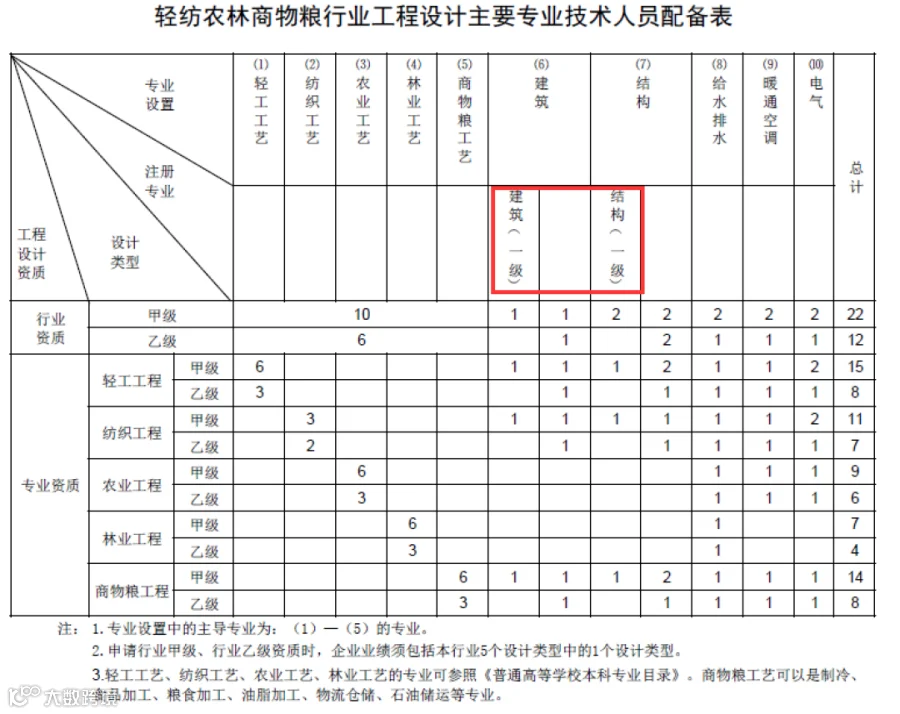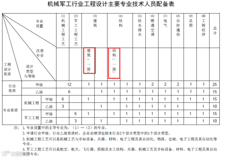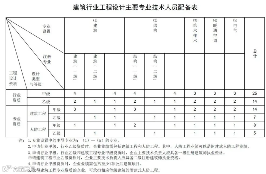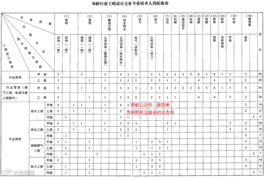 (2)对人员的要求,各专业和不同等级之间的变化不一。比如行业甲级对结构和建筑的注册人员要求增加了,专业资质中乙级对注册人数是降低了。变化最大的是水暖,之前是要求有注册的,新资质后去掉了。注意这个结论只是对建筑这个表要求的。