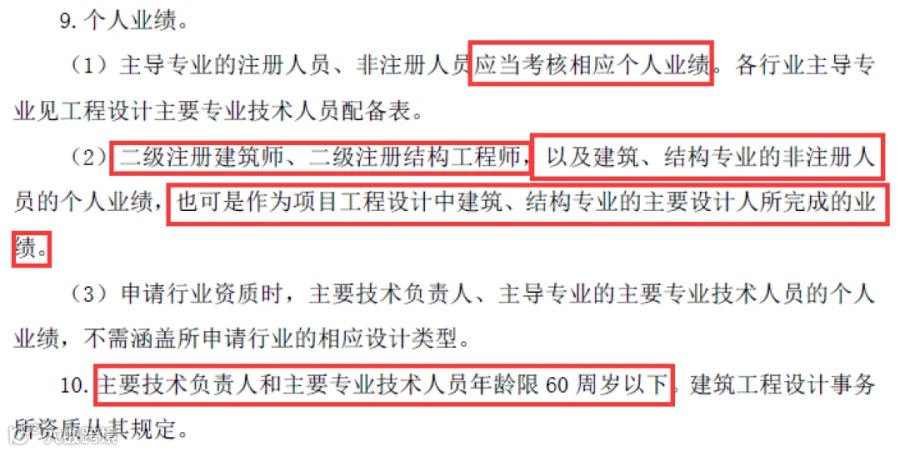 后文再次提及了个人业绩问题,所以大家一定要重视。此外提到了二级注册建筑师和二级注册结构师,完成业绩可以是以主要设计人完成(不要求必须是专业负责人),这个是二级注册比职称的优势。
