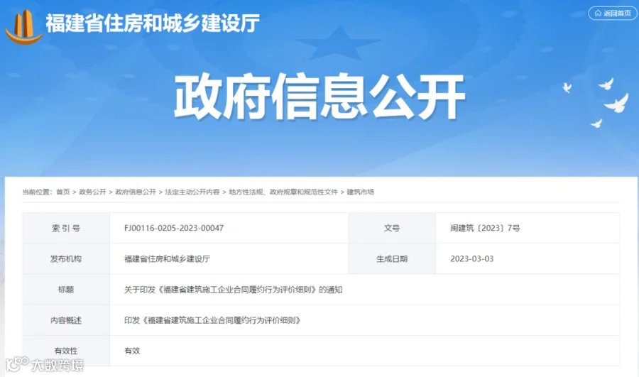 刚刚,福建省住建厅发布关于印发《福建省建筑施工企业合同履约行为评价细则》的通知,本实施细则自2023年4月1日起施行,有效期3年。