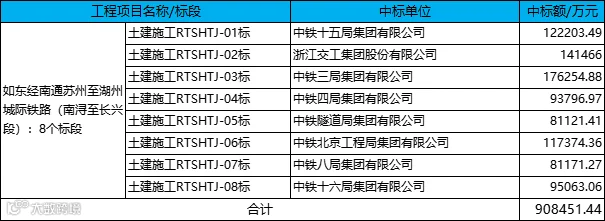 浙江省发布了如东经南通苏州至湖州城际铁路(南浔至长兴段)项目土建施工 8 个标段,中标总额约 90.8 亿元,是浙江省 2 月份最大的一项铁路工程。中标单位也是汇集了中国中铁 5 家工程局、中国铁建 2 家工程局,以及地方龙头建企浙江交工集团。