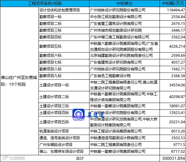 另外一个就是广东省的佛山经广州至东莞城际项目,共计有 19 个标段发榜,总中标额约 30 亿元: