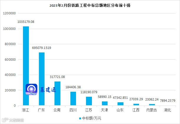 前述提到,浙江省、广东省的项目中标总额分列前二,这主要是来源于两大铁路项目。