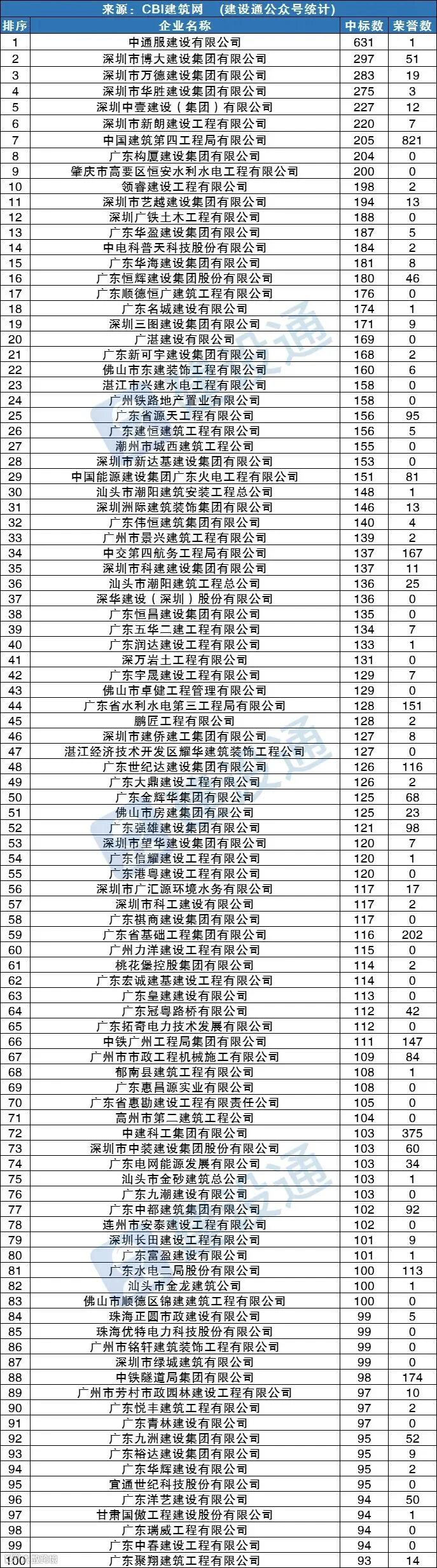 CBI建筑网综合报道:在2022年,广东建筑施工企业中标数量达168706项,同比(与去年同期)上升36.91%。其中,中通服建设有限公司、深圳市博大建设集团有限公司、深圳市万德建设集团有限公司分列中标数量排行榜前三位。