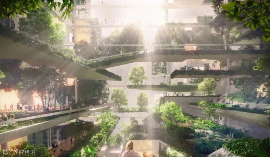 人们可以毫不费力地在5分钟内到达所有的公共设施。学校、住宅、办公室、公园、商场、体育馆、社区农场……全都不用再占着一块块的地,而是上下穿梭就能抵达。