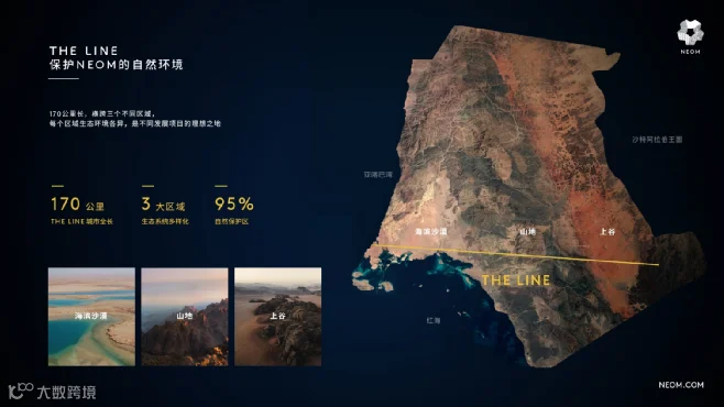 THE LINE项目是一个名副其实的线性城市,全长接近170公里,从红海亚喀巴湾一直向山区度假胜地和沙漠地形延伸,它横跨三个不同区域:海滨沙漠、山地、山谷,每个区域生态环境各异,各区域可根据环境条件发展不同项目。