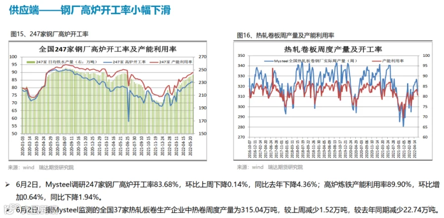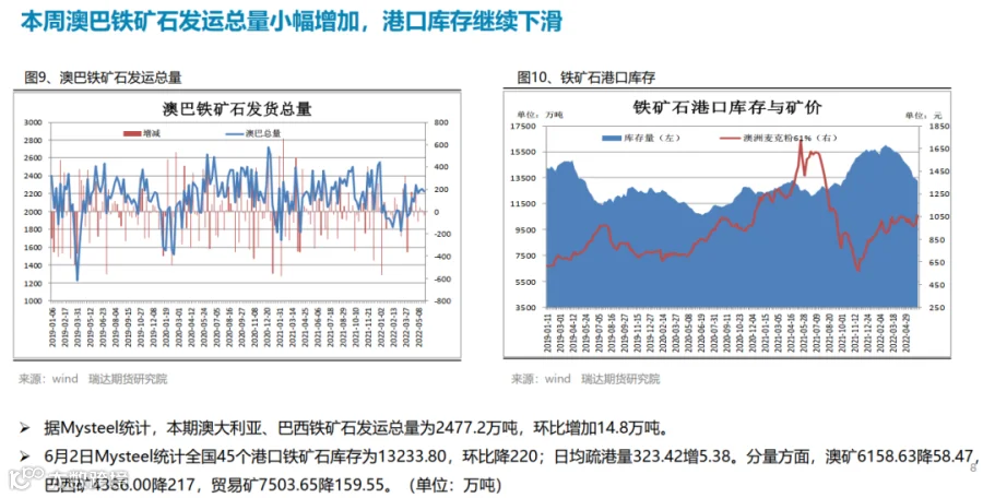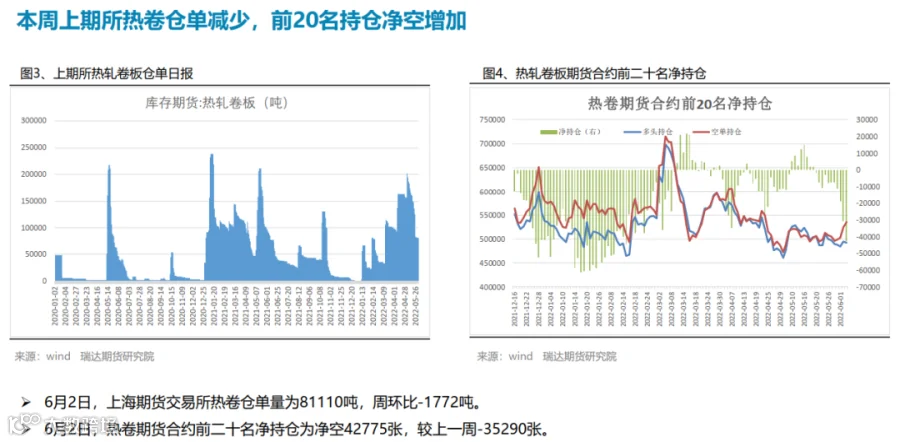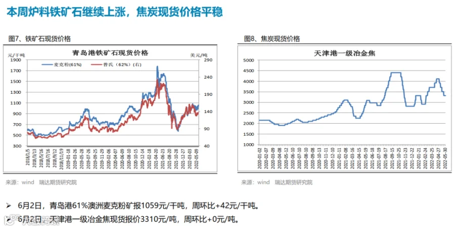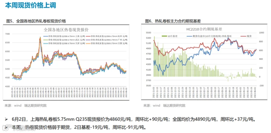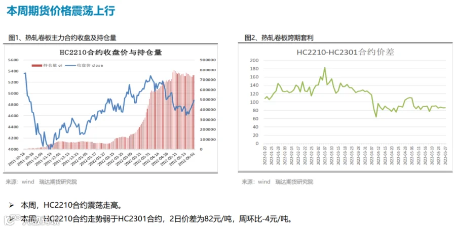 本周(5.27-6.2)热轧卷板价格持续反弹。近期国内稳增长政策密集出台,市场看涨情绪高涨持续推高。其中5月25日下午的全国稳住经济大盘电视电话会议召开,随后多个省份立即召开会议,抓项目、扩投资、扩内需成为重点; 5月31日国务院《扎实稳住经济的一揽子政策措施》,推出六个方面33项措施,并发出通知; 5月31日,财政部、税务总局发布《关于减征部分乘用车车辆购置税的通知》;6月2日国常会要求调增8千亿信贷用于基建。下周(6.3-6.10)热卷价格或延续震荡偏强。供应端,本期热卷周度产量继续下滑,但产能利用率仍维持在80%附近,周度产量低于去年同期22万吨,由于钢厂利润偏低,提产意愿不高。需求端,下游需求表现一般,热卷厂内库存与社会库存一降一增,库存总量变化不大。最后,稳增长政策仍是最大支撑点,市场仍预期在政策刺激下需求有望进一步提升。