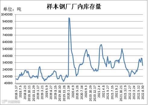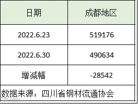 据四川省钢材流通协会统计,截止6月30日成都地区样本库房中螺纹钢及线材库存总量为490634吨,较上周减少28542吨,较去年同期增加50669吨。本期社会库存量继续回落,由于下游需求有所回暖,叠加钢厂检修增多,供应量下滑。