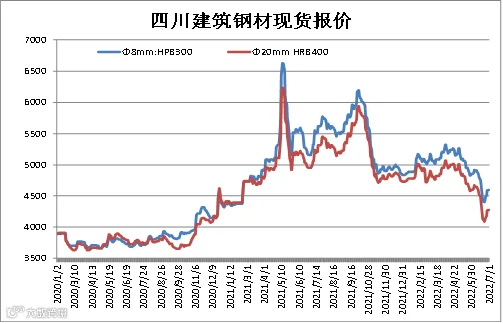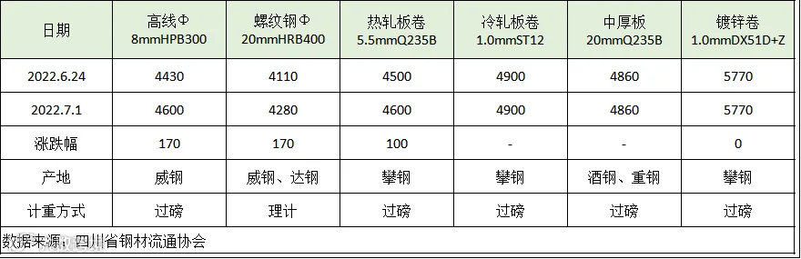 据四川省钢材流通协会对成都现货市场监测显示,本期建筑钢材价格止跌回升,因国内经济数据回暖及钢厂高炉检修增多,支撑建筑钢材价格走高。7月1日,成都地区Φ20mm HRB400螺纹钢价格为4280元/吨,较6月24日涨170元/吨;Φ8mm HPB300高线价格为4600元/吨,涨170元/吨。