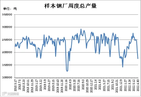 (6月24日-6月30日)四川省钢材流通协会对四家样本钢厂关于建材产量统计数据显示,本周A、C、D较上周减少5700吨、4000吨、22700吨;B较上周增加1091.81吨。四家样本钢厂总产量为175029吨,周环比减少31308吨。