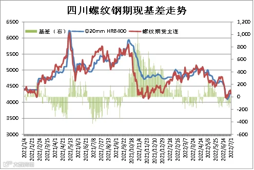 从近五年统计数据显示,成都建筑钢材现货价格与上期所螺纹钢期货价格存较强联动性,基差正常波动区间为0-400元/吨。本周现货价格强于期货,7月1日成都Φ20mmHRB400现货价为4280元/吨,RB2210合约期价为4265元/吨,基差为15元/吨,周环比+94元/吨。(备注:基差=现货-期货)