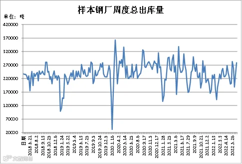 (6月24日-6月30日)四川省钢材流通协会对四家样本钢厂关于建材出厂量统计数据显示,A、B、C较上周分别增加3300吨、22341.72吨、22000吨;D较上周减少7700吨。四家样本钢厂总出厂量为278539吨,周环比增加39942吨。