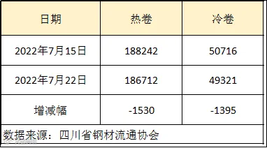 据四川省钢材流通协会统计,本周成都地区样本库房中热卷库存量为186712吨,较上周减少1530吨。冷卷库存量为49321吨,较上周减少1395吨。