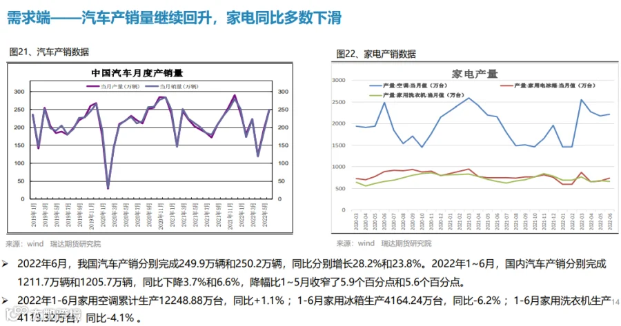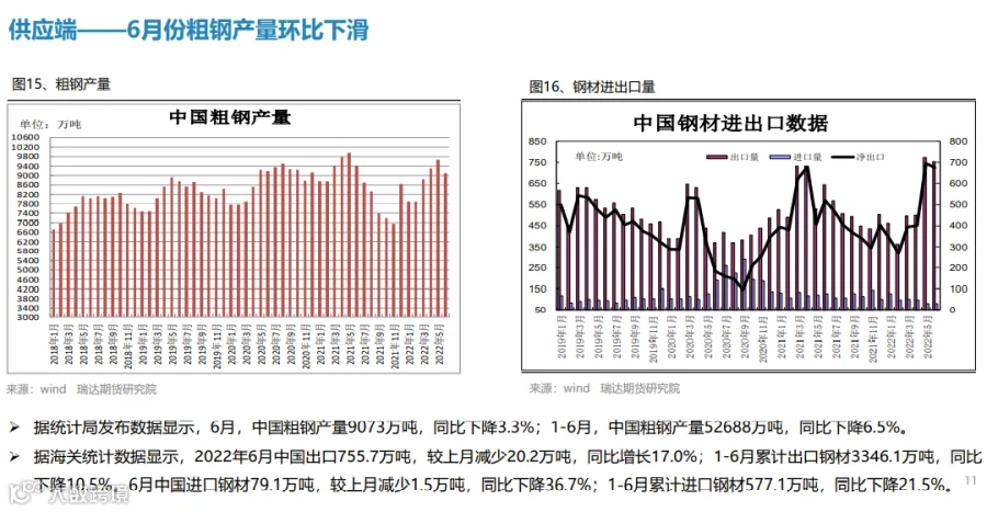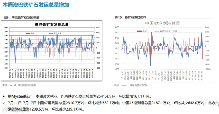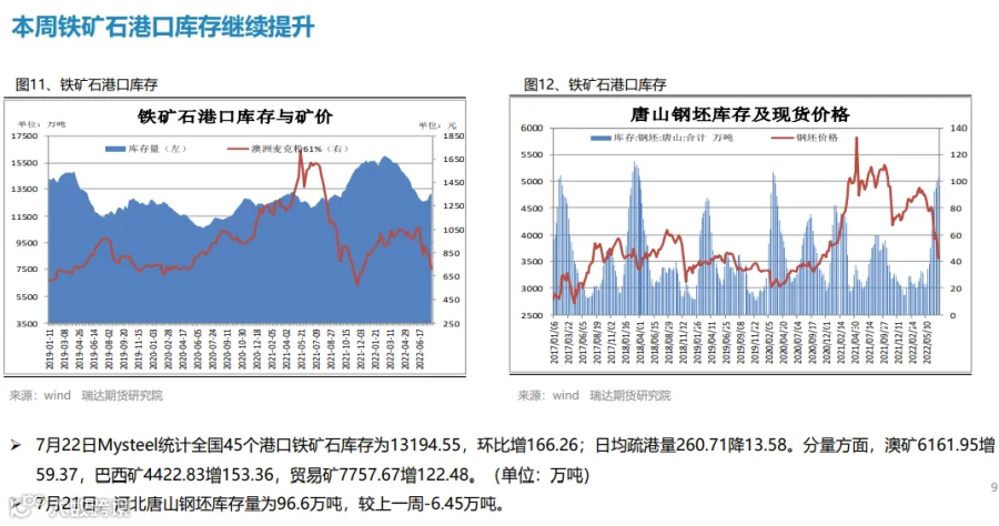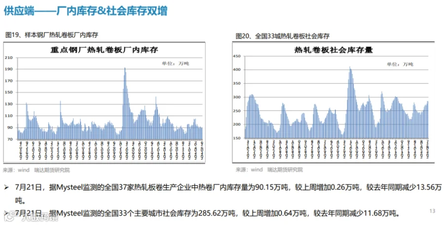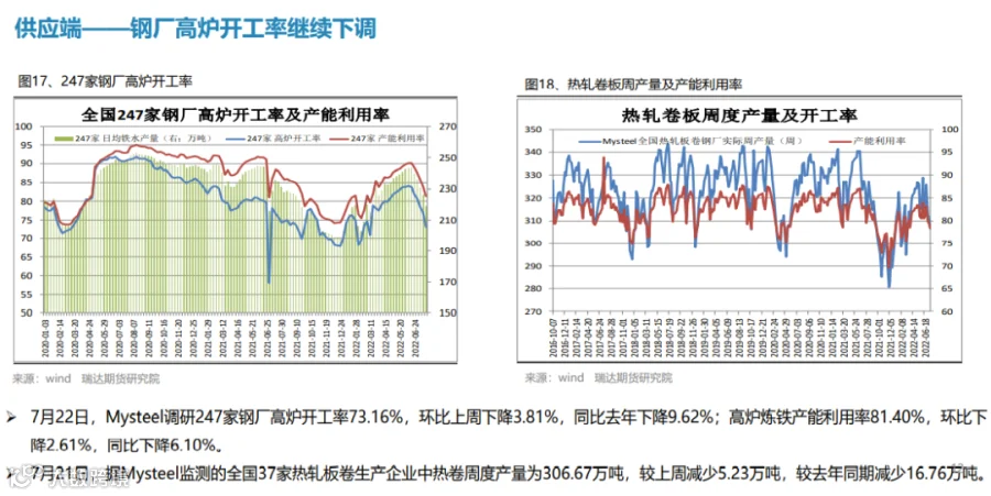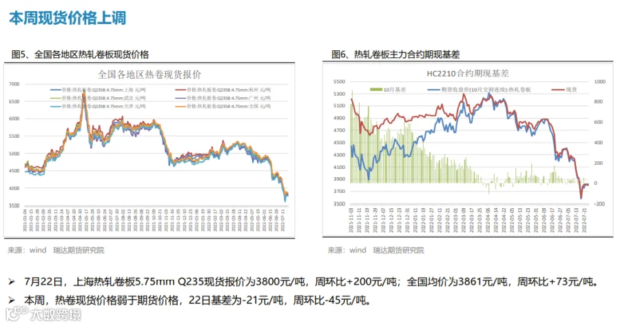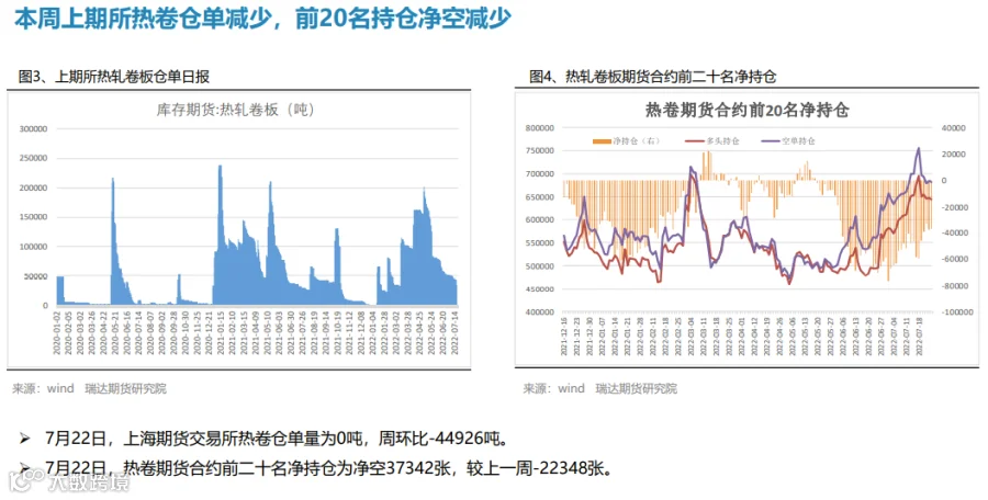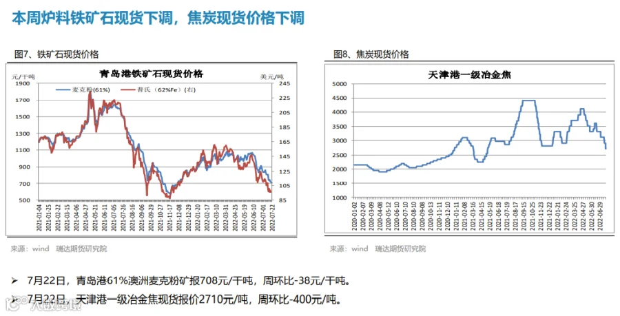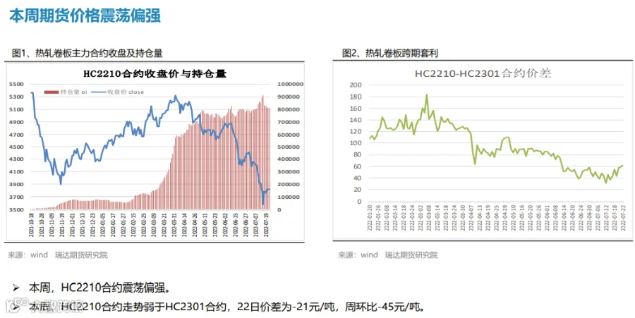本周(7.15-7.22)热轧卷板价格震荡偏强。由于市场对美联储7月加息100点预期降温,美元指数高位回调对大宗商品价格构成支撑。另外河北钢坯现货逐步上调,一定程度上提振市场情绪。叠加热卷周度产量延续小幅下滑,只是厂库及社会库存继续增加,限制期价反弹空间。下周(7.22-7.29)热卷价格或区间宽幅整理。供应端,本期热卷周度产量继续小幅下滑,但产能利用率降至80%下方,由于钢厂仍处亏损边缘,减产或延续一段时间。需求端,下游需求整体仍表现一般,热卷厂内库存与社会库存延续小幅回升,市场静待需求释放。最后,美联储将于7月26至27日召开联邦公开市场委员会(FOMC)会议,市场预估美联储将至少升息75个基点。