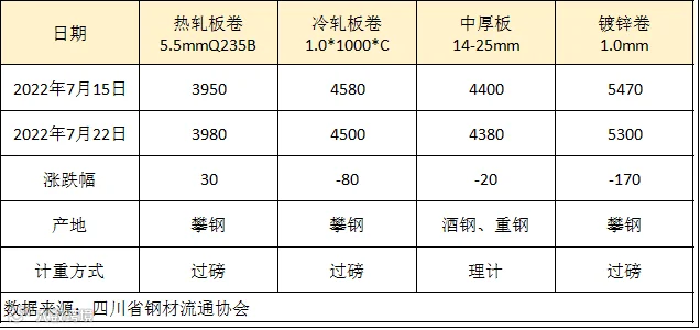 表一:本周四川市场部分板材价格变化汇总(单位:元/吨)