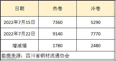 本周四川省钢材流通协会对样本钢厂关于板材出货量统计数据显示,热卷出货量9140吨,较上周增加1780吨。冷卷出货量7770吨,较上周增加2480吨。