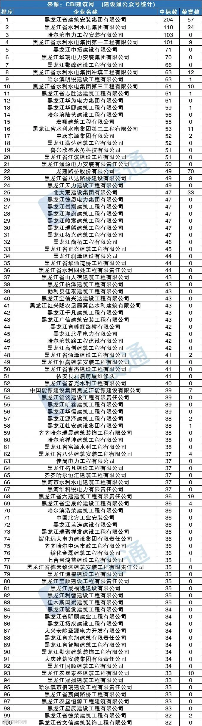 CBI建筑网综合报道:在2022年,黑龙江建筑施工企业中标数量达35699项,同比(与去年同期)上升35.00%。其中,黑龙江省建筑安装集团有限公司、黑龙江省水利水电集团有限公司、哈尔滨电力工程安装有限公司分列中标数量排行榜前三位。