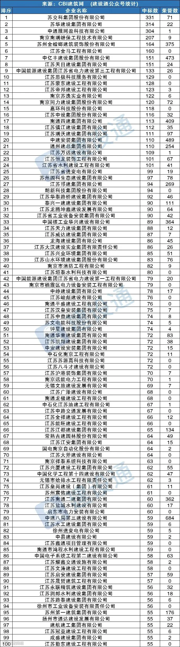 CBI建筑网综合报道:在2022年,江苏建筑施工企业中标数量达121882项,同比(与去年同期)下降2.30%。其中,苏交科集团股份有限公司、苏华建设集团有限公司、中通服网盈科技有限公司分列中标数量排行榜前三位。