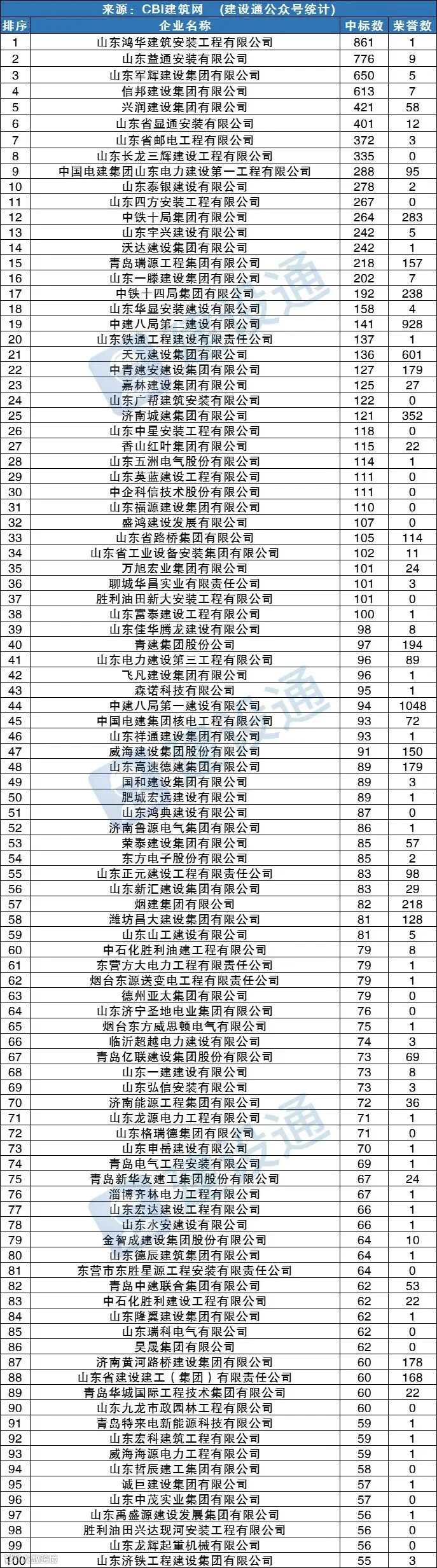 CBI建筑网综合报道:在2022年,山东建筑施工企业中标数量达93810项,同比(与去年同期)上升4.46%。其中,山东鸿华建筑安装工程有限公司、山东益通安装有限公司、山东军辉建设集团有限公司分列中标数量排行榜前三位。
