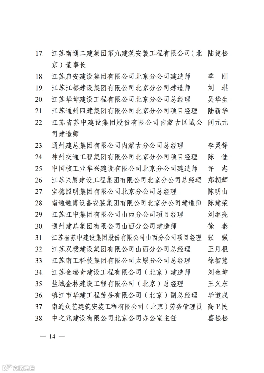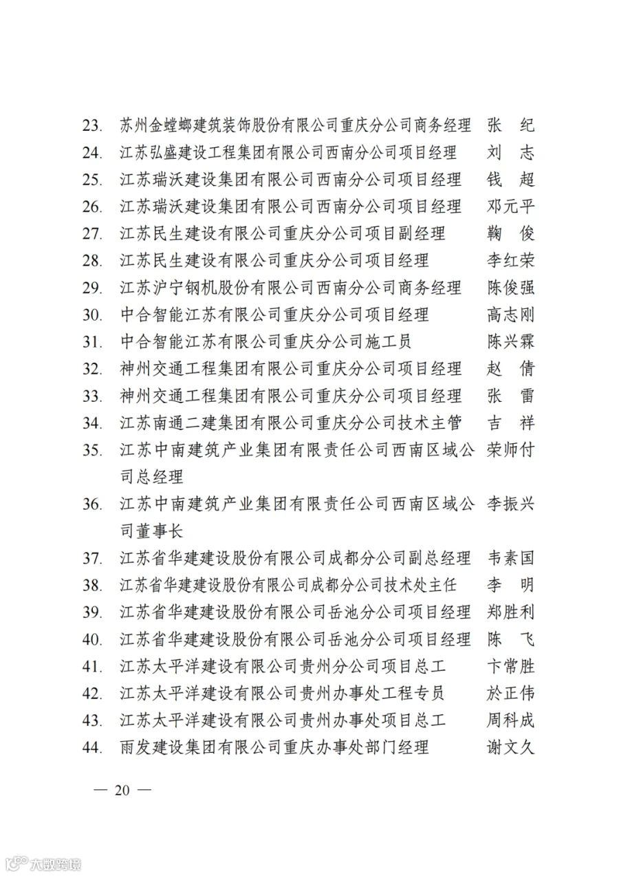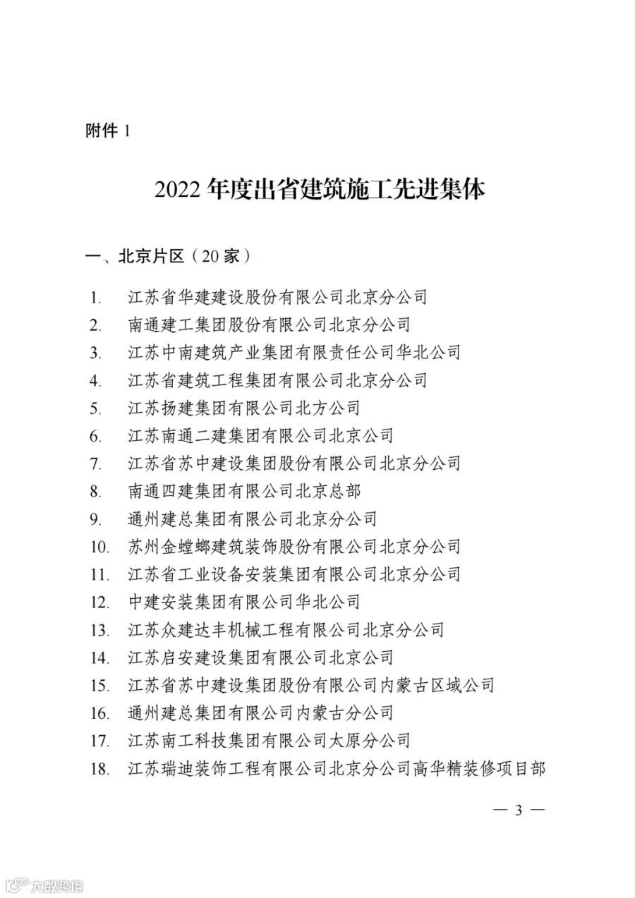 2022年,全省出省建筑施工企业全面学习贯彻党的二十大精神,按照省委、省政府部署要求,坚持稳中求进工作总基调,坚持以新发展理念引领高质量发展,切实扛起“争当表率、争做示范、走在前列”光荣使命,凝心聚力,攻坚克难,全省出省建筑业在多重困难挑战中保持较好发展态势、跃上新的台阶,为推进全省建筑业高质量发展、谱写“强富美高”新江苏建设新篇章作出了积极贡献。为表扬先进,经研究决定,对江苏省华建建设股份有限公司北京分公司等200家单位和吕进等435名同志予以通报表扬。