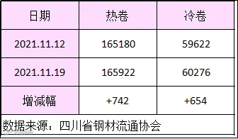 据四川省钢材流通协会统计,本周成都地区样本库房中热卷库存量为165922吨,较上周增加742吨。冷卷库存量为60276吨,较上周增加654吨。