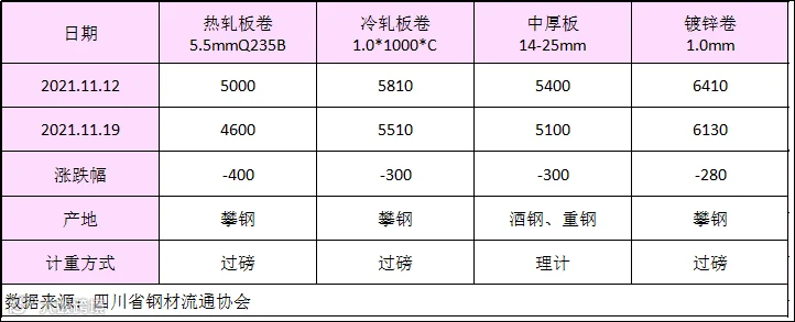 据四川省钢材流通协会对本周成都现货市场监测显示;热轧板卷较上周下跌400元/吨;冷轧板卷较上周价格下跌300元/吨;中厚板价格较上周下跌300元/吨;镀锌板价格较上周下跌280元/吨。