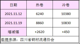 本周四川省钢材流通协会对样本钢厂关于板材出货量统计数据显示,热卷出货量8860吨,较上周增加2620吨。冷卷出货量10830吨,较上周增加450吨。