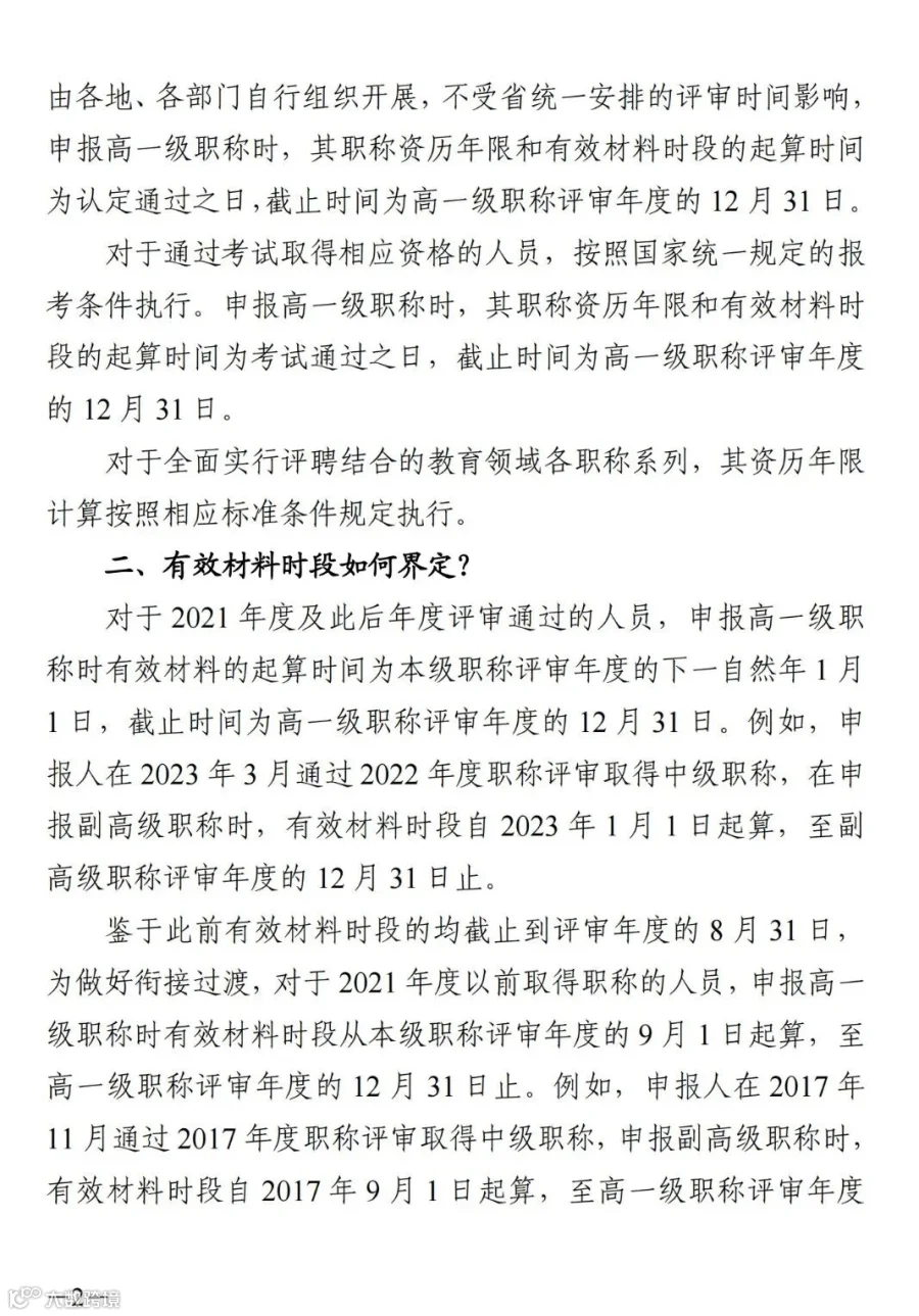 (一)对于2021年度及此后评审取得职称的人员,评审高一级职称时,职称资历年限和有效材料时段的起算时间为本级职称评审年度的下一自然年1月1日,截止时间为高一级职称评审年度的12月31日。