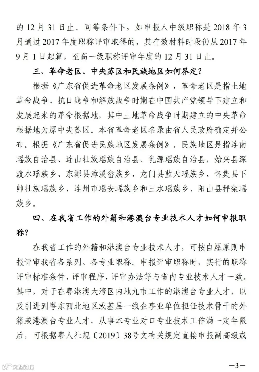 2、对于引进到粤东西北地区或基层一线企事业单位担任技术骨干,具有大学本科、硕士研究生、博士研究生学历的外籍和港澳台专业人才,可参照粤人社规〔2019〕38号文有关规定直接申报副高级或正高级职称。
