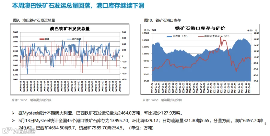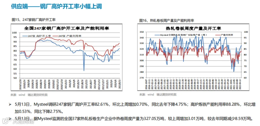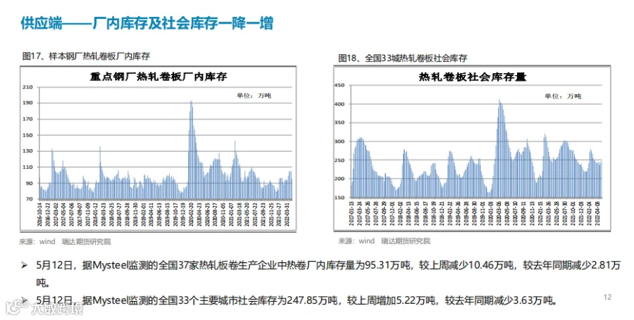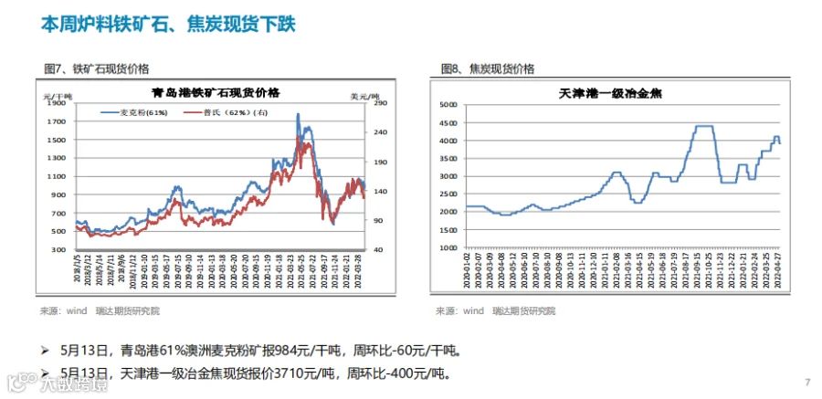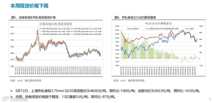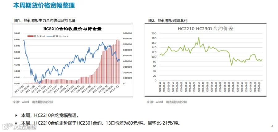 本周(5.6-5.13)热轧卷板价格陷入区间宽幅整理。由于美联储后市加息预期强烈,支撑美元指数持续走高,拖累钢材在内的大宗商品价格。另外热卷终端需求表现不佳,降库缓慢。只是随着钢厂利润大幅收缩, 挺价意愿提升,对热卷期现货价格构成一定支撑。下周(5.13-5.20)热卷价格或延续震荡行情。供应端,热卷周度产量继续回升,产能利用率上调至83.5%,主要增幅地区是华北地区,由于厂库陆续有所缓解,钢厂排产有所恢复。需求端,下游需求表现一般, 库存下降缓慢,但近日上海举行的市疫情防控工作新闻发布会,高层表示要努力在5月中旬实现社会面清零。最后,市场仍寄望疫情结束后需求进一步释放。