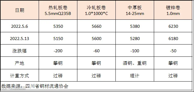 据四川省钢材流通协会对本周成都现货市场监测显示;热轧板卷较上周价格下跌200元/吨;冷轧板卷较上周价格下跌60元/吨;中厚板价格较上周下跌100元/吨,镀锌卷价格较上周价格下跌50元/吨。