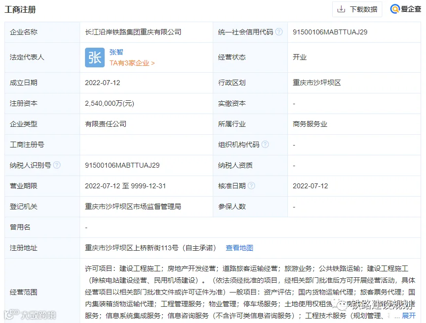 7月12日,由长江沿岸铁路集团、重庆发展投资公司共同出资建立长江沿岸铁路集团重庆公司,在沙坪坝上桥新街注册成立,注册资本高达254亿元,主要负责承建沿江高铁重庆至成都(成渝中线高铁)及宜昌至涪陵(重庆)段。事实上,今年3月公布的沙坪坝区2022年重点项目,就提到长江沿岸铁路集团重庆公司将落户于此。