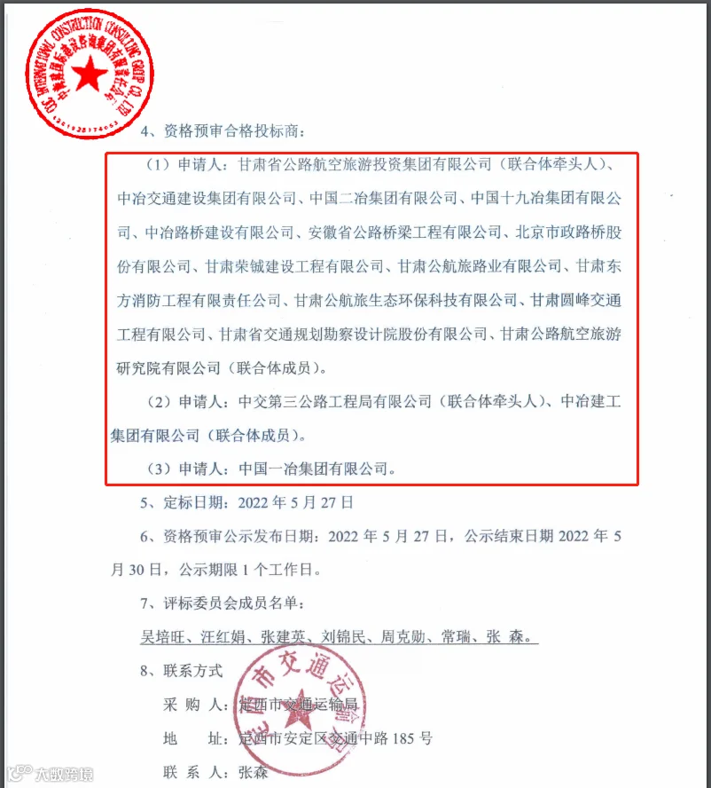 第一候选社会资本方:甘肃省公路航空旅游投资集团有限公司(牵头方)、中冶交通建设集团有限公司、中国二冶集团有限公司、中国十九冶集团有限公司、中冶路桥建设有限公司、安徽省公路桥梁工程有限公司、北京市政路桥股份有限公司、甘肃公航旅路业有限公司、甘肃荣铖建设工程有限公司、甘肃东方消防工程有限责任公司、甘肃公航旅生态环保科技有限公司、甘肃圆峰交通工程有限公司、甘肃省交通规划勘察设计院股份有限公司、甘肃公路航空旅游研究院有限公司;