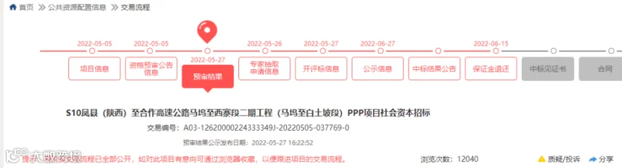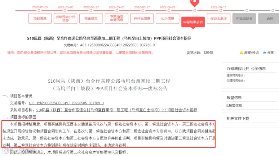 近日,定西市交通运输局S10凤县(陕西)至合作高速公路马坞至西寨段二期工程(马坞至白土坡段)PPP项目社会资本招标废标/终止公告,截图如下: