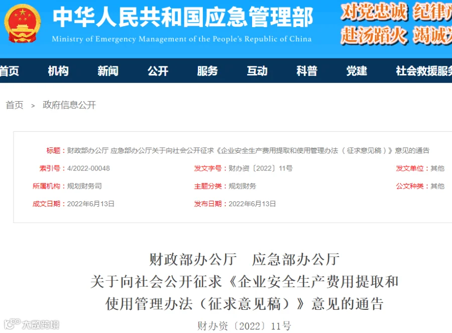 为进一步加强企业安全生产费用管理,财政部会同应急部对《企业安全生产费用提取和使用管理办法》进行了修订,研究起草了《企业安全生产费用提取和使用管理办法(征求意见稿)》,现面向社会征求意见。相关单位和个人可以在7月13日前,通过以下途径和方式提出意见: