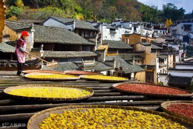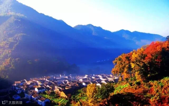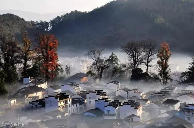 白霭中的村庄充满了徽派建筑的古朴之感,四周环绕的树木高高低低,绵绵的红叶给这幅静默的山水画添上了火热的色彩。