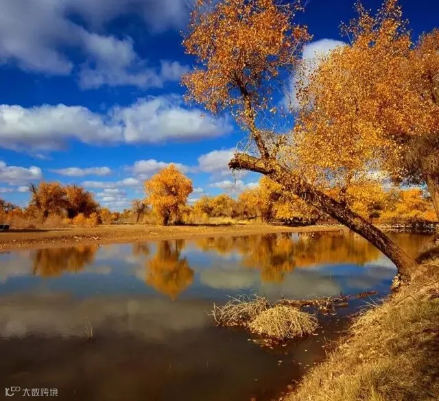 晴空万里蓝镶白,胡杨浸秋入人怀,黄叶翻飞着画境,柔情若水不思归。这就是额济纳的秋天。