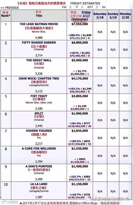 根据《好莱坞报道者》预测,《长城》将在为期四天的总统日假期里取得一千四百万到一千九百万美元的票房,落后于《乐高蝙蝠侠》2500万的预计票房和环球公司的情色大片《五十度黑》,但在新片中排名第一。