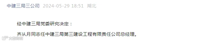 齐从月同志任中建三局第三建设工程有限责任公司总经理。