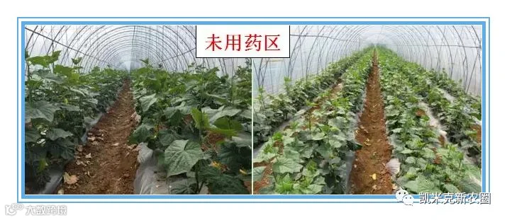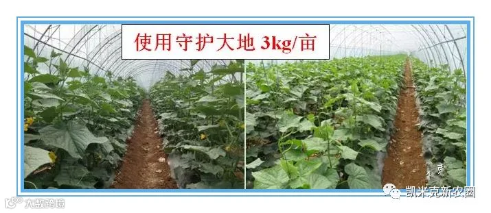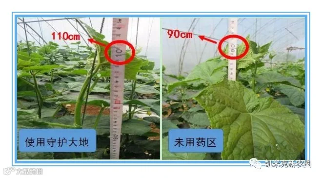 通过上述实图可以看出:使用守护大地后黄瓜枝叶繁盛、叶片浓绿,长势整齐一致,且株高比对照区高20cm,即守护大地能够促进促进黄瓜生长更快、植株更健壮、长势更旺!