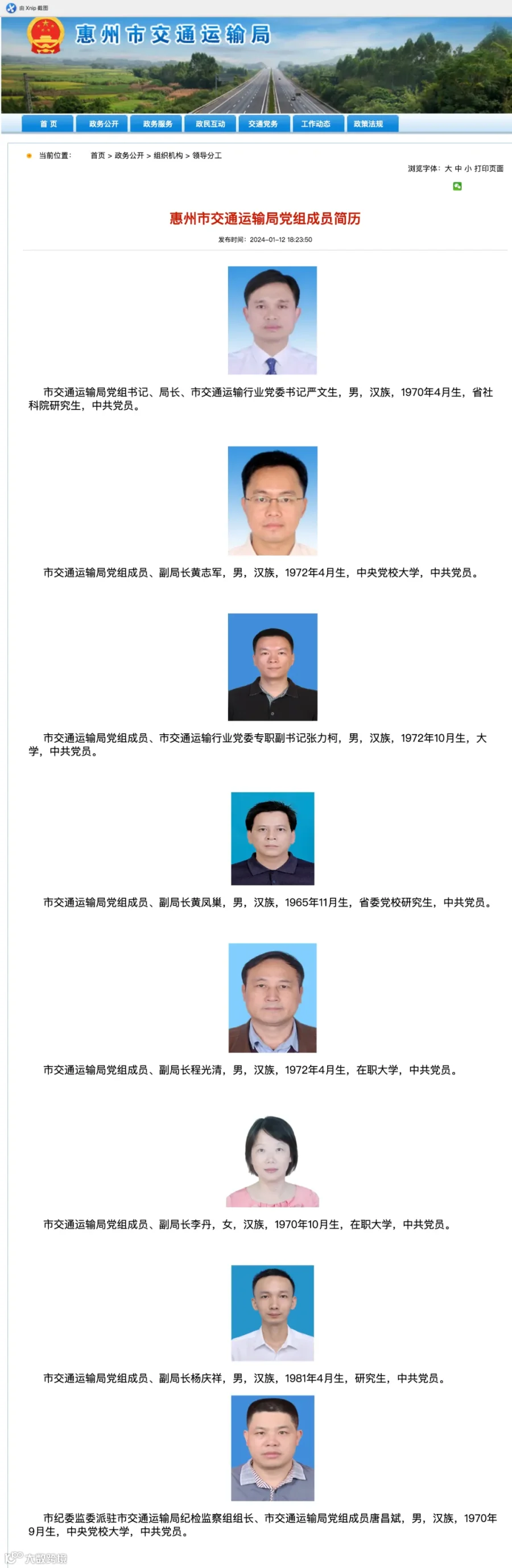 此前1月份,在惠州交通运输局官网上,杨庆祥以党组成员、副局长排名第7,在分工协调上,负责统筹规划、计划和发展战略,负责项目前期工作及后期评价、收费公路工作;负责高速公路服务区、收费站管理工作;负责城市道路及其附属设施、智慧停车场工作;负责道路交通网络规划和轨道交通规划修编工作;负责项目建设工作专班。协助负责惠州港区规划修编工作。还分管局综合规划科、城市道路建设管理科、市交通规划与建设事务中心。