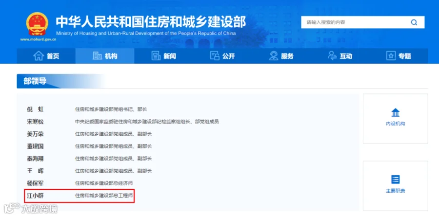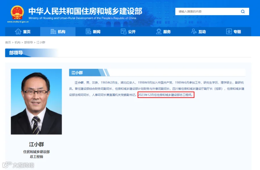 12月20日,住房和城乡建设部官网“部领导”栏目更新信息显示:江小群任住房和城乡建设部总工程师,李如生不再担任。